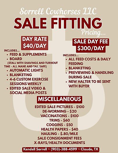 Sorrell Cowhorses LLC is now offering sale fitting services to the public! Conveniently located just 30 miles east of Amarillo, TX, we specialize in creating customized programs tailored to meet the unique needs of you and your horse. With years of experience starting 2-year-olds, achieving success in the show pen, and consigning top sellers, we are committed to helping your horse stand out. At Sorrell Cowhorses, every horse receives daily, hands-on care and attention — they’re never just a number in our barn.