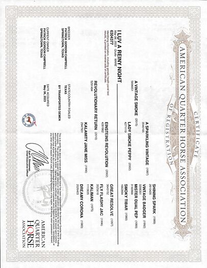 By homozygous black, record-breaking, 600K sire, A Vintage Smoke (A Sparkling Vintage x Lady Smoke Peppy) and out of a dun daughter of Einsteins Revolution (Great Resolve x Fly Flashy Jac) she has the performance bloodlines to excel in various disciplines. Both parents are over 15.0HH so she has potential to step into the roping/barrel pen as well.
