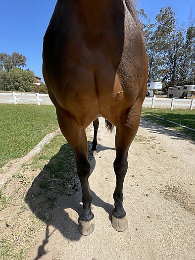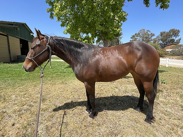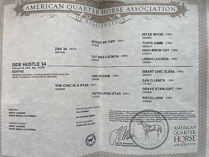 2023 dark bay filly sired by NRCHA Futurity Champion Zak 34 out of a Chic Please mare. I had big plans for this filly but life has changed them. She has all the ground work done, ready to start with the trainer of your choice. Ties, trimmed regularly and vaccines. She is feely and quick on her feet. Beautiful long mane and thick tail. 6 panel negative tested. Show home only, I own her dam. I think she would make either Cowhorse or cutter.