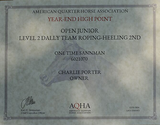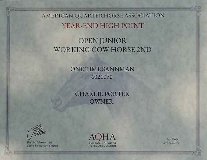 One Time Sannman is a phenomenal horse. In 2022 he scored a 224 down the fence at the NRCHA Snaffle Bit Futurity. 2nd place out of 307 entries put him back in the finals where he ended up 13th out of 307 head. Since that day he has won several Futurities and Derbies. Won a total of $45,000. Top ten in three events at the 2024 AQHA World Show. He has his Open AQHA Superior in Working Cowhorse. He has his Open AQHA Superior in Heeling. He has 175 Open AQHA Performance points in eight events. He is qualified for the 2025 AQHA World Show in Halter, Reining, Working Cowhorse, Breakaway, Heeling, Ranch Riding and All-Around, and Luke would love to show him. Teeth are good. Both are down. Barn favorite at Jones Performance Horses due to his eagerness to show and his super respectful disposition. Safe for man, woman or child. SUPER broke and a delight to show. Open caliber horse that would excel at Limited or Non Pro. Once in a lifetime horse. Only reason he is for sale at all is my age ! LOVE the horse. Last eight photos are some of his foals. Just received the three awards at the end.PorterQuarterHorses.com