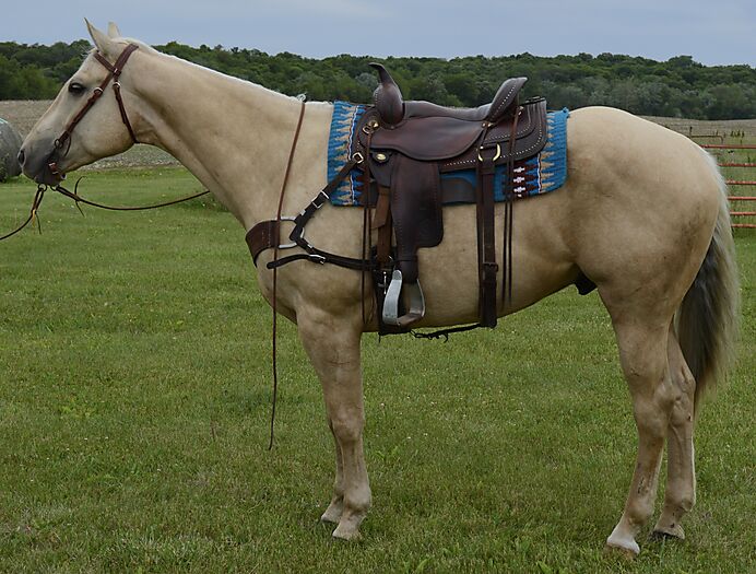 Big Jake is a local horse some freinds of mine raised from a weanling. Ridden off and on as a two/three year old. Four year old year he was sent to a trainer where he roped the hot heels and was started on barrels by a 12 year old girl. He just returned from the week long trail ride at Emminence, Mo. Kids, dogs, 4-wheelers, people, parties, all the above at Emminence ! Crosses water, logs, whatever. He was belly deep crossing a fast moving river, no problem. Been on several overnight campouts. Some had stalls, some a high line, some a hitch rail. He will stand tied all day, or night. Stands great for the farrier. Loads great. 100% sound. A full brother to him is a friend on mines go to horse. Big Jake is a big, strong, forward moving gelding. Over the years these geldings with this bloodline have been incredibly tough. Head horse/ Heel horse/Ranch horse/Pickup horse waiting for his next chapter. Delivery available. PorterQuarterHorses.com