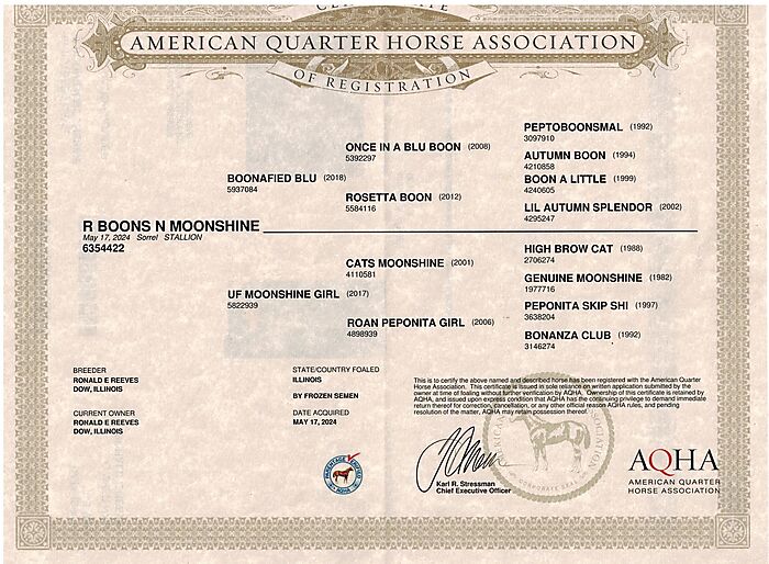 2024 Sorrel stud colt 5 Panel N/N by parentage sired by "Boonafied Blu" an NCHA earner in excess of $116,000, Limited Open Futurity finalist, NCHA Open Futurity semi-finalist and out of a daughter of Cats Moonshine who is an NCHA earner of $143,000 Located north of St Louis 35 mile in Illinois.