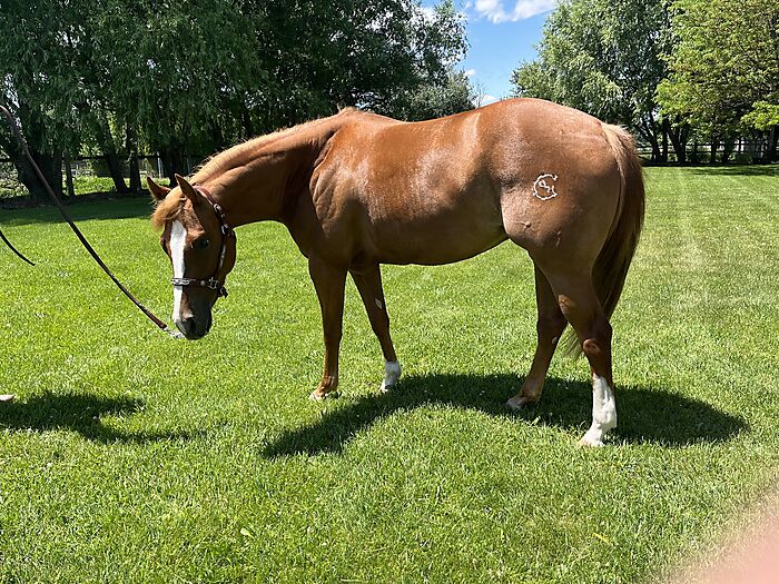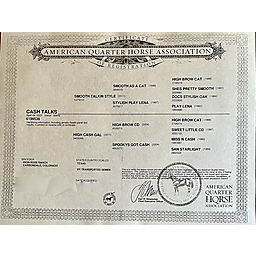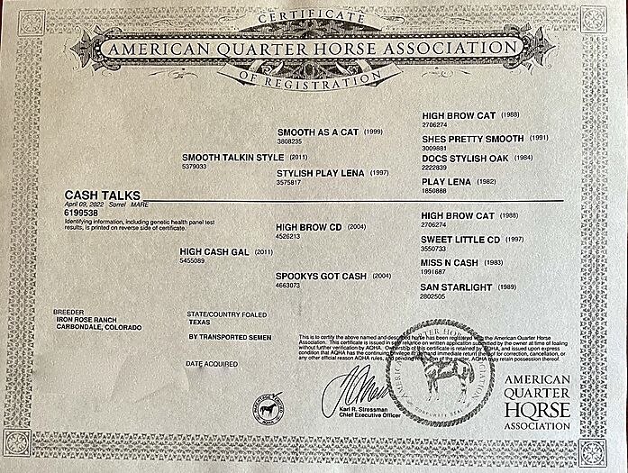 Cash Talks-3yro mare-Sire: Smooth Talkin Style-Dam: High Cash Gal $76,385K+ NCHA (Her 2nd foal) 2nd Dam: Spookys Got Cash $22,200K NCHA, PE $218,470k, 3rd Dam: San Starlight $30K+ NCHA, PE $1,554,913K+. She is AQHA & APHA reg. Paid into SS and PCCHA foal incentives. Clean X-rays, 6 panel 5 N/N , N/HRD.
