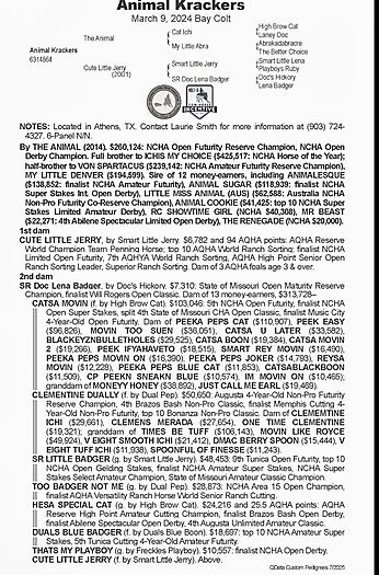 His dam, Cute Little Jerry, earned 94 AQHA points and was a World Champion Team Penning Horse. She’s produced three AQHA foals to date and traces directly to a deep female line led by SR Doc Lena Badger, a producer of more than $313,000 in earnings.