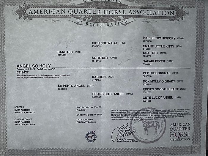 This coming two year old has an amazing brain and is as uncomplicated to handle as they get. With an amazing sire like Sanctus she has the potential to be a top cutting / cow horse. She's already interested in herding cows around. She is easy to catch, loves attention and baths, easy for the farrier. She is offered at 15k. Please contact Nikola at 502.807.5009 for more information and videos. She is located in Corydon, Indiana