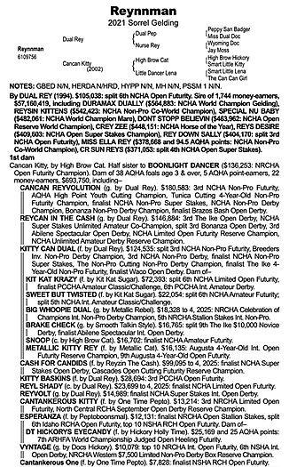 Reynnman is a big bodied, powerhouse gelding sired by the Legendary Dual Rey and out of Cancan Kitty (PE $693,750). Reynnman aka "Sixx" has been lightly shown in the open/limited open major events. He is ready to go show with any level rider.