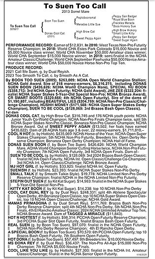 • Sire: Boon Too Suen ($263,009, NCHA Open World Champion Stallion) – sire of over $6.3M in earners.