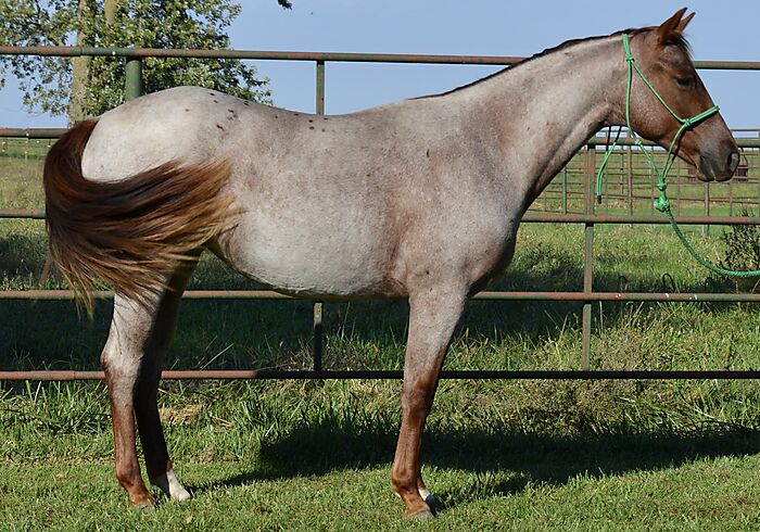 Jesse is a beautiful filly by an own son of the great 6666 stallion, BET HESA CAT - LTE:$272,151.00, PE:$8,800,000.00. Pepto Taz has an LTE:$132,224.00 and PE:$1,944,430.00. Jesses Dam goes back to the great "KING" five times! Easter King, Poco Bueno, Leo, etc. Jesse is extremely quick, catty, athletic and for sure has "the look". Pedigree full of TOP stallions. Jesse is owned by our grandsons in Denver Colorado. She will stay under the guidance and care of Porter Quarter Horses here in Missouri until sold. Delivery available. 66zero-483-zero648