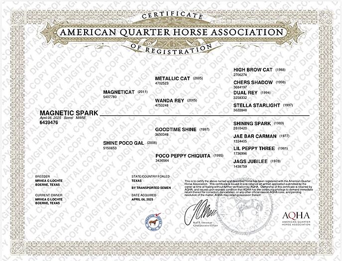 Sired by Magneticat, 7 panel negative son of Metallic Cat x Wanda Rey. Riata Stallion.