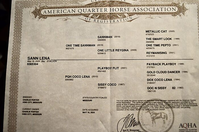 Sann Lena is by One Time Sannman. LTE:$46,650.00., 175 AQHA Open Performance points, AQHA Superior Award in Open Heeling, AQHA Superior Award in Open Working Cowhorse. 2nd in the Nation Open Working Cowhorse. 2nd in the Nation Open Heeling. 4th in the Nation Open Breakaway. Headed to the 2025 AQHA World show in Open Cowhorse, Open Breakaway, Open Heeling and Open Ranch Riding. (pictured). Sann Lenas Dam, PQH Coco Lena, is by our Stallion, Playboy Flit. She is Freckles Playboy, Doc OLena and Hickory Dee Doc. Sann Lena is eligible for the Iowa Ranch Horse Futurities as a yearling, two year old, three year old and four year old. Super nice Performance/Stallion prospect. One Time Sannman won his class in Heeling at the Troy Whited Memorial Jackpot in Lincoln Nebraska Sept 13th. Top call back out of. 47 teams. Won the class !! Delivery available.