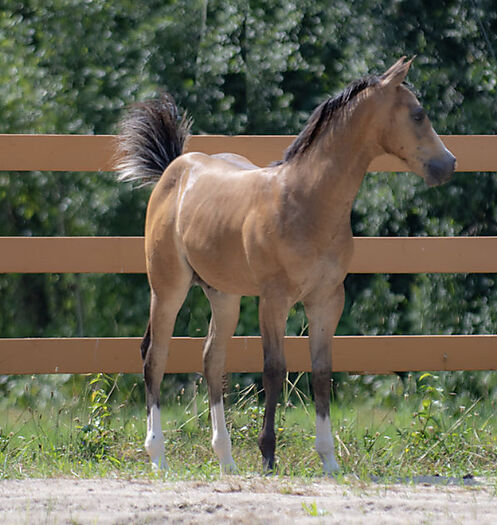Streaker also has a dorsal stripe, shoulder shadowing and bars behind his knees and although cannot be a Dun- he carries all the markings of one.