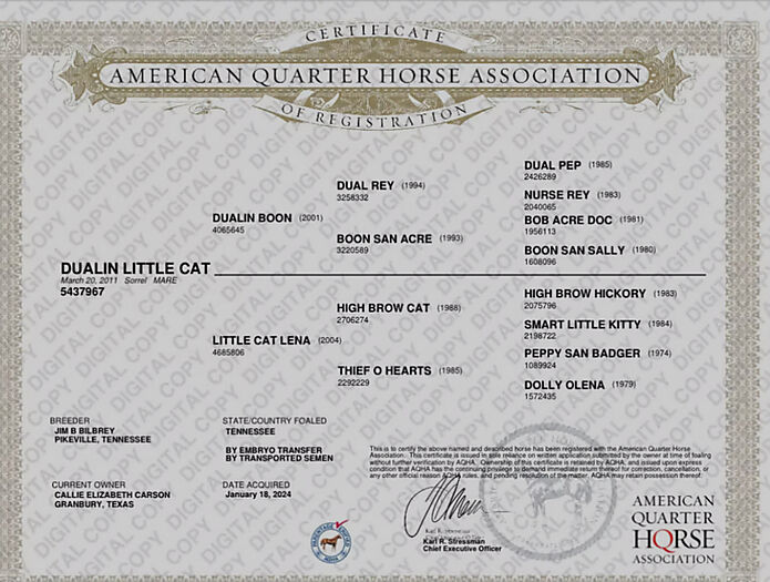 Her sire is Dualin Boon LTE$ 115k and offspring earning of over $ 1 million including the 2019 NCHA Open World Champion CR Gotcha Covered LTE $300K.