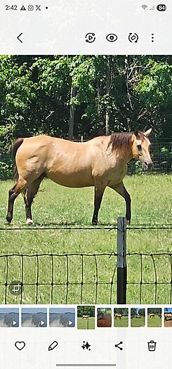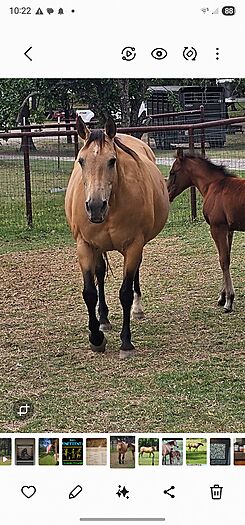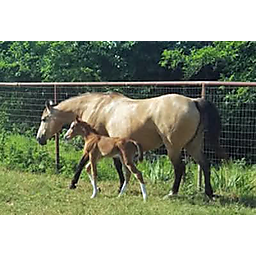 AQHA Buckskin Mare. She was used for ranch work when younger and bred three times to exceptional cutting horse stallions. Her 2025 colt is an exceptional individual out of a Once In A Blu Boon stallion. She is the perfect outcross for cutting stallions. AQHA 5 panel negative, Color genetics - Buckskin -A/a, E/e, nd1/nd2, CR/n, W20/n. Quiet and easy to handle. We are cutting down our horses and are offering her to be your next good producer. Don't miss this great offer. Located in Lipan, TX.