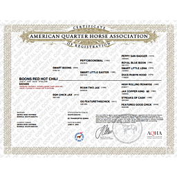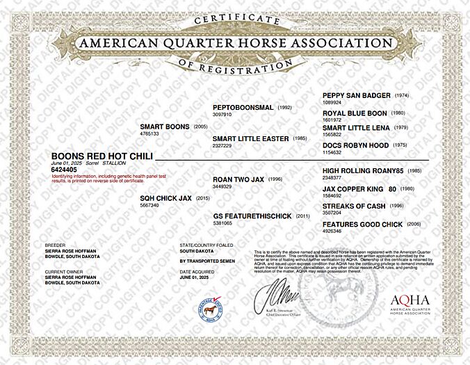 Meet BOONS RED HOT CHILI “Chili Pepper,” a 2025 AQHA Sorrel stud colt (6 Panel N/N) with elite bloodlines, a calm, people-loving personality, and the versatility to excel in reining, cow horse, roping, or barrel racing. Paid into Riata Buckle, NARS, and Royal Crown Roping, Chili Pepper is sired by Smart Boons (LTE $192,772; NRCHA Champion; sire of $1M+ earners) and out of SQH Chick Jax, a granddaughter of Adash For Cash and carrying the influence of High Rolling Roany. With proven cow horse, speed, and ranch genetics, Chili Pepper is a top prospect for both performance and future breeding. South Dakota | (605) 281-9220