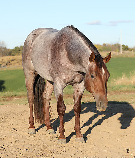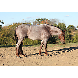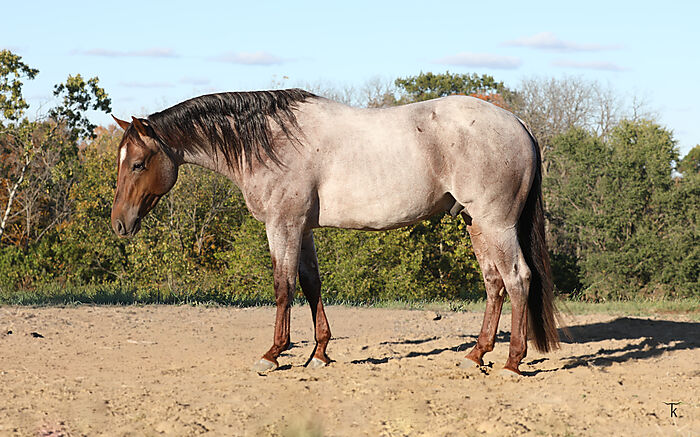 Outstanding 2 year old red roan stallion by 2X AQHA World Champion Meteles Cat (LTE $437, 016) NCHA Hall of Fame Stallion and one of the cutting horse industry's most distinguished horses. And out of CR A Little Peek (LTE over $ 70,000). He is a quick footed colt and a smooth mover. He has been in professional cutting training since January and on track for the futurity.