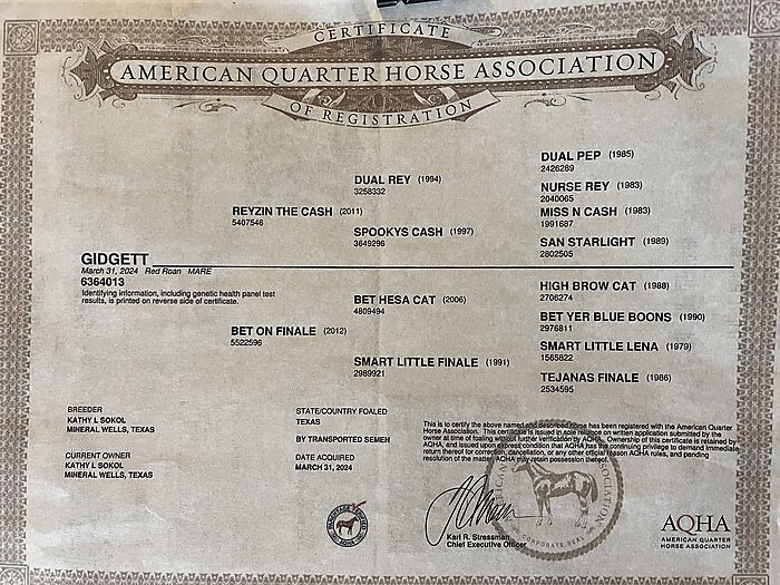 Introducing our 2024 double registered red roan filly (AQHA & APHA) Sire “Reyzin The Cash” www.ReyzinThecash.com Dam “Bet On Finale” earnings $81,525.40 Eligible for many incentives: NCHA Futurity, Superstakes, Breeders Invitational , Royal Crown, Gold Buckle, Chrome Cash, NRCHA Stallion Stakes, PCCHA South Point Futurity Incentive, 6666 Ranch Incentive Program, Ted 386-235-9647