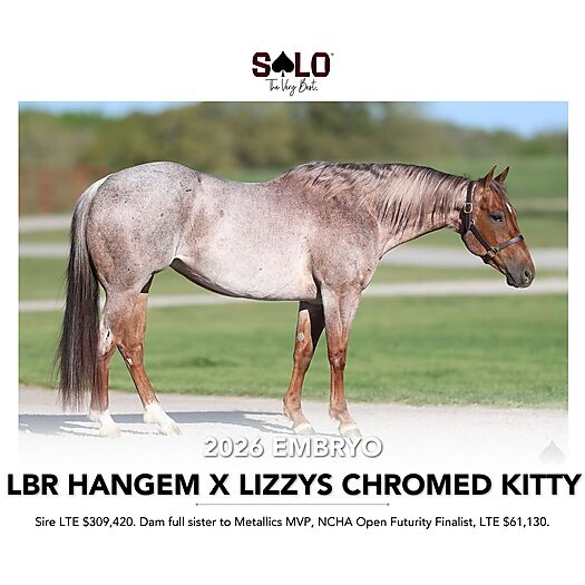 This offering is THE shot at an open futurity caliber horse! This embryo is by Solo’s resident stallion and cutting sensation LBR Hangem, earner of $309,420, the NCHA Summer Spectacular Co-Champion, multiple-time Open and Derby Champion, and truly the outcross of the future. “Shotty” is a freak athlete who’s had the cutting world buzzing all year long.