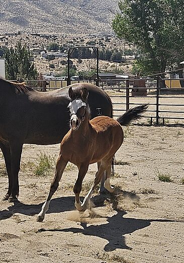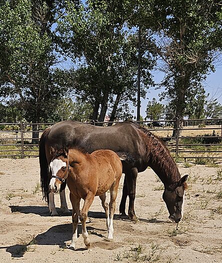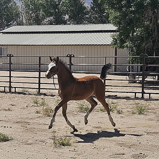 DROP DEAD GORGEOUS YEARLING GUNNER FILLY! This filly will stop you dead in your tracks! She is a Bay Splash with 4 White Socks and 2 Blue Eyes with black eyeliner. She is as fancy as the day is long and she knows it! Already showing the cow side of her pedigree and lopes around looking as smooth as can be. This filly is very correct in every way, she has a beautiful little face, big eyes and huge bone. Her dam is a NCHA $ producer and is sired by the king himself~High Brpw Cat. If you're looking for perfection without the 6-figure price tag, check her out.