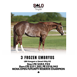 Now, that momentum carries into the breeding shed. These three frozen embryos are by LBR Hangem and out of Smart Kitty RG, the NCHA Open Futurity Reserve Champion herself, an earner of $211,383 and a proven producer with $318,942 in offspring earnings.