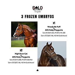 Two of the embryos are sired by High Brow Cat whose influence has shaped the modern western performance horse industry. He earned $110,784 during his career and is now a $97.5 MILLION SIRE. The third embryo is sired by Solo Select’s very own, Woody Be Tuff. “Woody” is the heart and soul of Solo Select and has sired so many champions including Wood She B Magic who won $385,803 and was the bronze CHAMPION at the NCHA OPEN Futurity. He is now a $15.1 MILLION SIRE!
