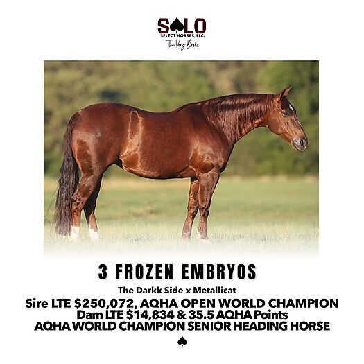 TWO AQHA WORLD CHAMPION HEAD HORSES COLLIDE! Here are THREE opportunities at a top of the line cross by the rope horse industry’s most exclusive young sire out of a proven performer and producer. These embryos are by The Darkk Side, AQHA World Champion with over $250,000 in earnings. If you didn’t secure a breeding from the drop that SOLD OUT IN 31 MINUTES this year, this is your opportunity at THREE incredibly crossed Darkk Side foals!