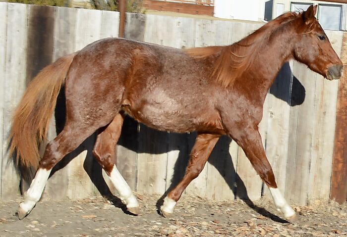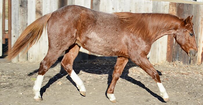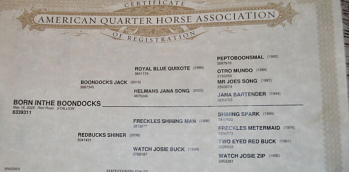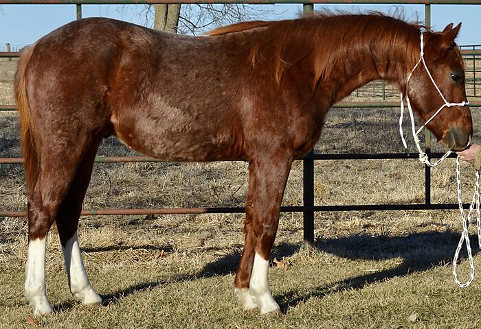 Boon is a gorgeous Red Roan, "own son" of the great "Boondocks Jack" - LTE:$5,120., 104 AQHA Performance points. Boons Dam is an "own daughter" of "Freckles Shining Man" - LTE:$10,766., 102 AQHA Performance points, and an own son of the legendary "Shining Spark"! Royal Blue Quixote, Peptoboonsmal, Mr Joes Song, Shining Spark and Two Eyed Red Buck are ALL on Boons face papers! Who's who of Performance horses! Boon is not gonna be a 16h Head horse. What he will be is a great Heel horse, Team Penner, Tie Down horse, Trail horse, Cutting, Youth horse or Cowhorse. Great project for an up and coming young horse trainer. He'll mature at 14 hands. He is very correct and has a lot of eye appeal! Personable disposition and wants to be your friend. He will shed his winter coat and be a gorgeous red roan color! Boon is a Rope horse just waiting his turn! Boon is eligible for the Howard Pitzer Invitational Futurities, Nebraska Ranch horse Futurities and the Gold Buckle Futurities. Opportunity knocking here at an affordable price! PorterQuarterHorses.com