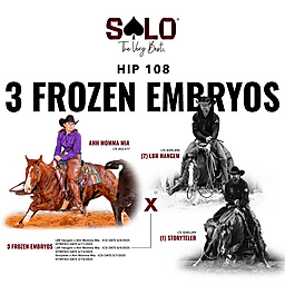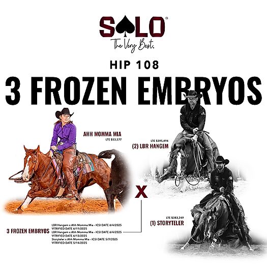 One of the three embryos is by Storyteler, earner of $383,249, American Performance Horseman Champion, 2x AQHA Fan Favorite, 3rd NCHA Super Stakes Open Derby, 3rd NCHA Super Stakes Open Classic, and 3rd Run For A Million Cutting Challenge Open. Storyteler is a ¾ sibling to the Million Dollar earner and NCHA Horse of the Year Kittennish, and a half sibling to NCHA Horse of the Year All Spice, as well as standout earners Badboonarising and Rollz Royce.