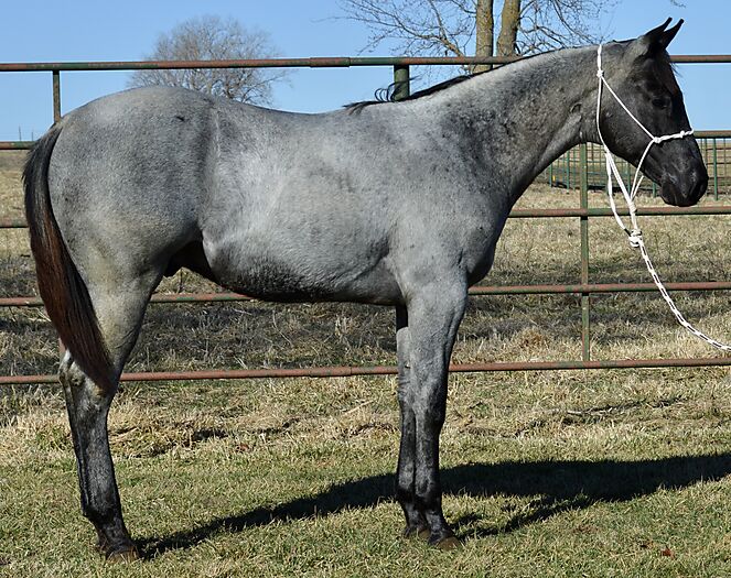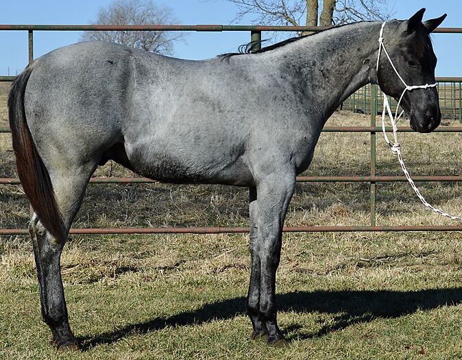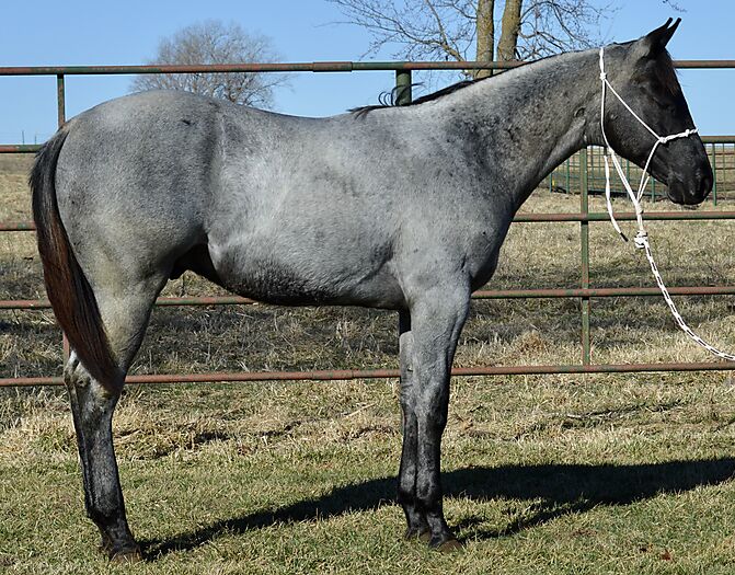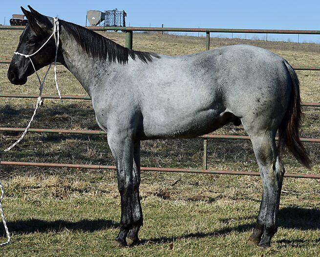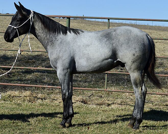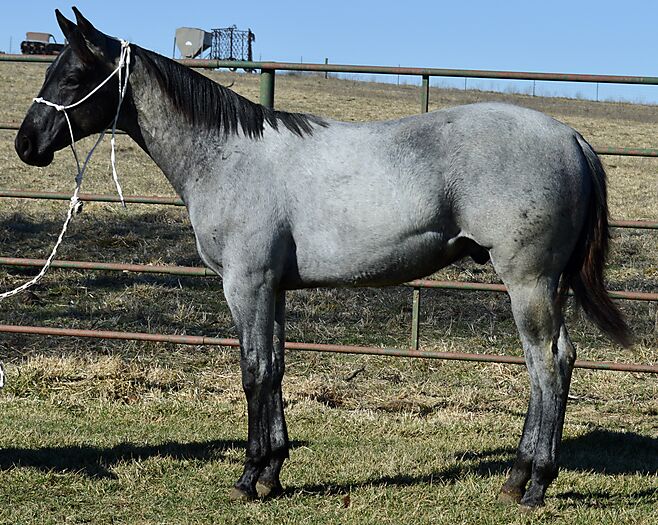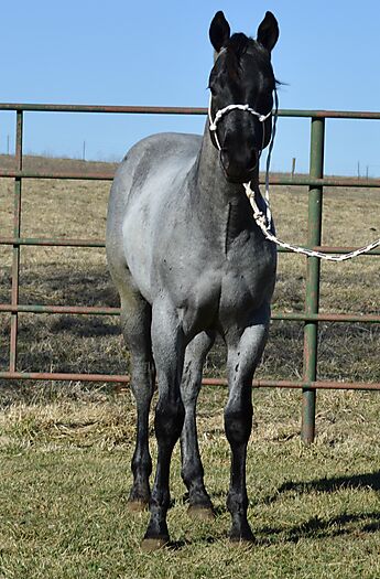 Razz is a gorgeous TRUE BLUE "own son" of the great Krogman Ranch stallion, Theolerazzledazzle. Black head. No white. Razz is as blue as blue gets! Super quiet and easy to get along with. Handled by a seven year old girl! Perfect head and ear. Top stallion prospect! Correct, sound, both down, straight in the mouth. The word "Kros" is on his face papers seven times! Ranch horse, Trail horse, Stallion prospect! If you want to raise top quality Ranch horses or if you want the prettiest mount going down the trail, here is your opportunity! Delivery available.PorterQuarterHorses com
