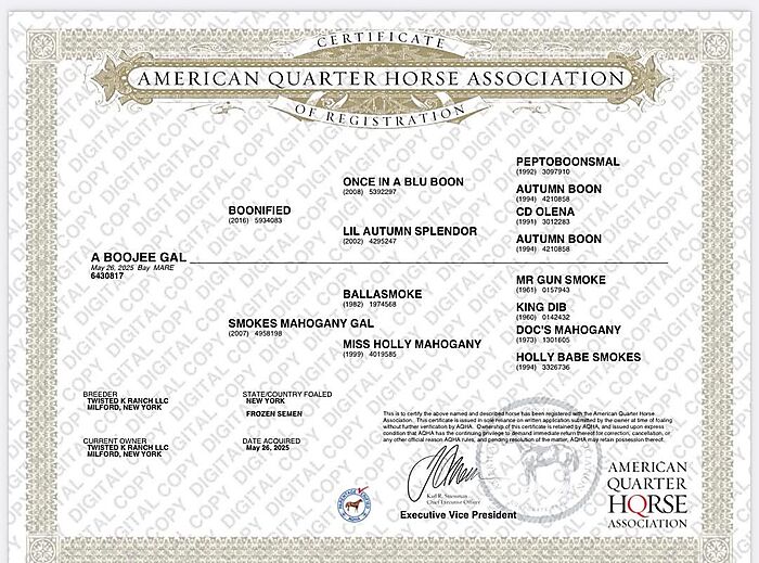 A Boojee Gal is a 6 panel clean 2025 filly that is feely, bright, and very curious. She sells halter broke with experience tying and trailering. UTD on vaccines and will stand for the farrier. She is not over handled but is safe enough to haul on long trips.