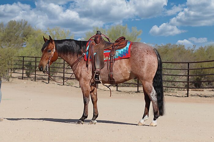 Own son of METALLIC CAT Offered lot #22. Introducing your 2021 AQHA Amateur Heel Horse of the Year! “Reyzin” is a winner, a winner of hearts, belt buckles, cash, national titles, and personalities. An absolute best friend, each and every day- from him trotting to catch you until you have to put him to rest for the night. His personality is truly memorable you will not be able to get him out of your head and heart!! He is one whom we have saddled up after months off and went straight to winning on him, he has zero buck and will go straight to work. Aboard Reyzin, we won the 2021 AQHA Sun circuit heeling, won $15K at the 2021 USTRC Finals, 2021 AQHA Heel Horse of the Year, Qualified for the world show, and also NCHA earnings in excess of $12,169. Trained by cutting horse trainer Tarin Rice. In 2019 Reyzin was also an Open Futurity Finalist at the NCHA West Texas Futurity. Our ranch is going to be so sad to see Reyzin leave, he is another staple of our place. This babysitter, yet eye appealing cutting horse is quiet in the herd, works his line, and will get in the ground and stop straight on his ends. Has packed numerous beginner cutters into the herd at shows and always comes out with a score!! Runs a neat reining pattern with an easy lead change, spins like a top, and can run and stop like a cow horse! Mr. All around, Ropings, Cuttings, Ranch Riding, Ranch Horse Events, Reined cow horse, and Versatility he sweeps the floor with his wins. Reyzin is a crowd favorite with his looks and amazingly sweet personality no matter what event we haul him to he becomes the center of attention and loves it! In the roping, he has timing, runs hard, rates with ease, has a stride that is super smooth, cool stopping and is strong from the horn. Reyzin makes heeling and breakaway EASY. Just looking for a hassle-free ride across your ranch and trails—Reyzin is Extremely smooth and easy to cue to walk, trot, canter, stop, side pass, and back with or without a saddle and even bridle-less. His main goal is to please, he has proven to be safe in every situation we have put him in inside or outside the arena! On the ranch he gets along with other horses and down the trail, he will ride out alone or happy to lead or follow, safe traveling on any type of terrain, he is not spooky and will go anywhere that you point him. He is already seasoned to the road and is great to haul, he will be competed on up until the sale. Reyzin is truly a one-of-a-kind super sweet and talented gelding that will be ready to show and win for you. A truly once-in-a-lifetime, unique gelding, with CREDENTIALS!! We would love to schedule a time for you to come try him for yourself give us a call at 406-381-2347 we know you will just fall in love with him! Sound, current radiographs, UTD on worming dental and farrier. He has passed all vetting and sale sifting to sell at the League of Legends Invitational August 5 & 6th!