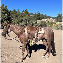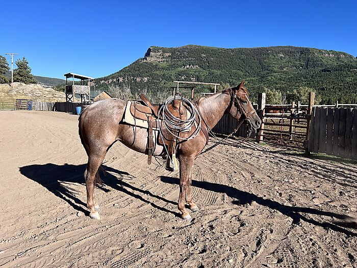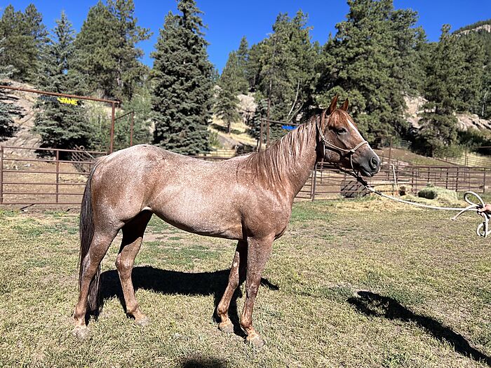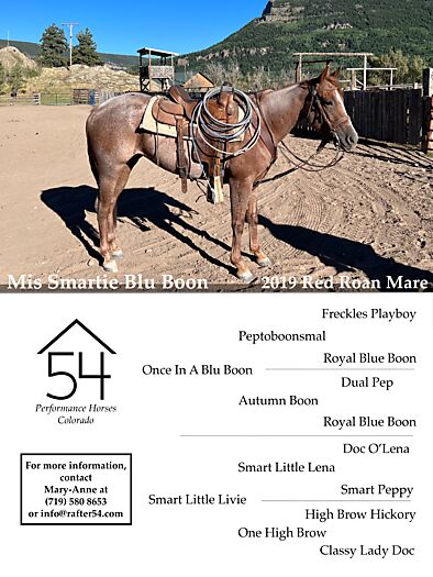 OWN DAUGHTER of Once in a Blu Boon out a of Smart Little Lena daughter. This royally bred eye-catching red roan is a quick learner and eager to please. She's about 14.2 and still growing/filling out. Top tier prospect for cutting, breakaway, heeling, or ranching. 4 Panel N/Hrd & located in Colorado. Owned by Rafter 54 Performance Horses.