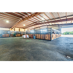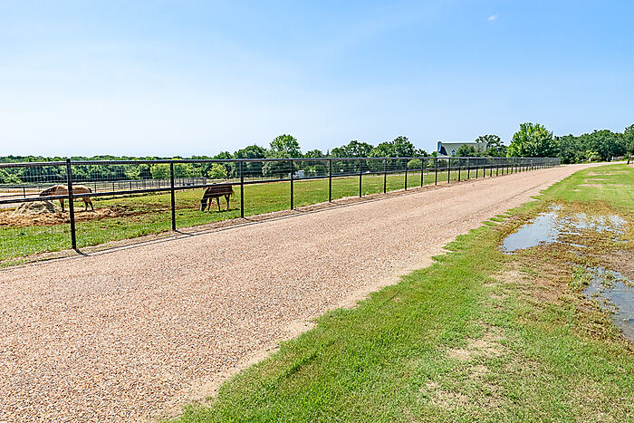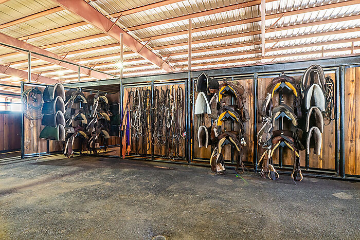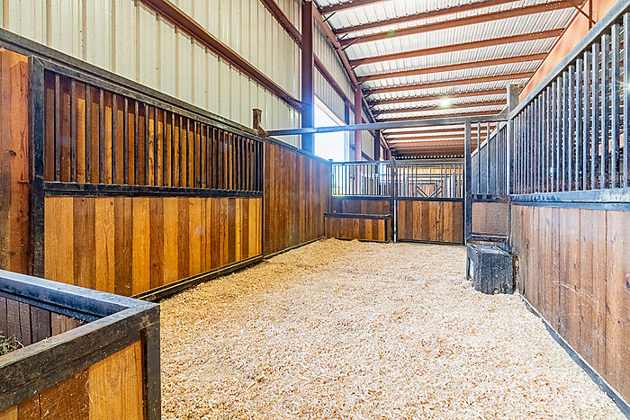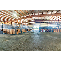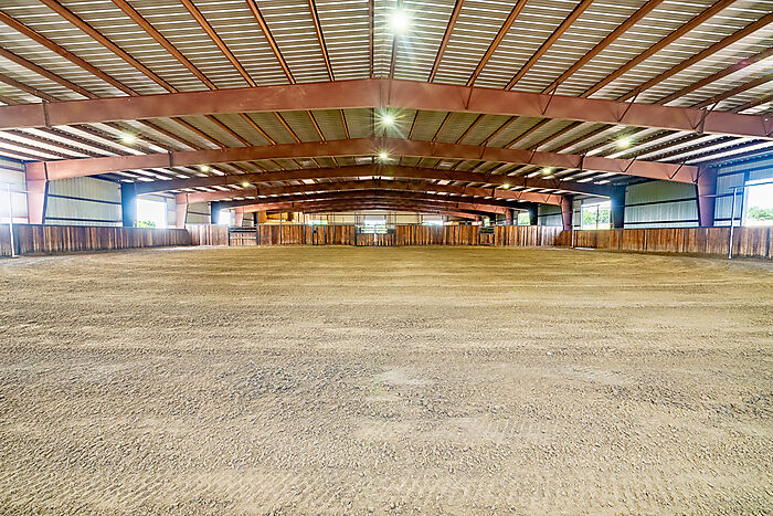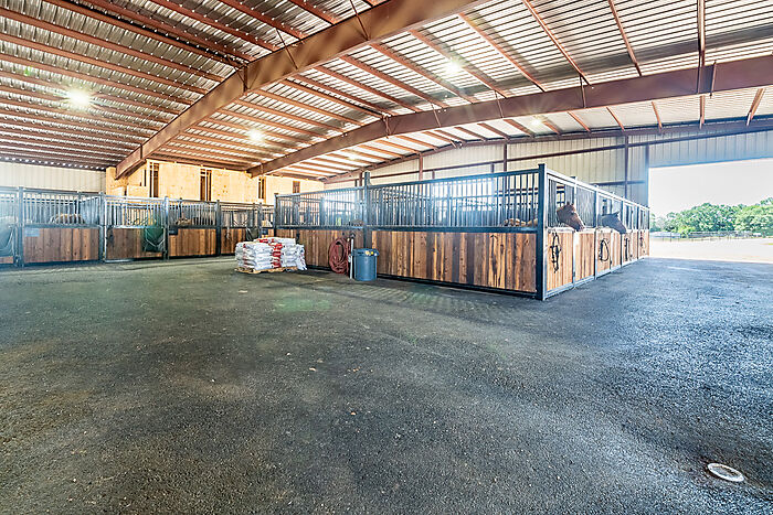 COMMENTS: The all-encompassing covered horse facility is extremely functional, comfortable, and well planned. The utilization of space, wide asphalt walkways, and tall ceiling is impressive. There is also a 3-pond drainage system developed around the entire property to prevent flooding.