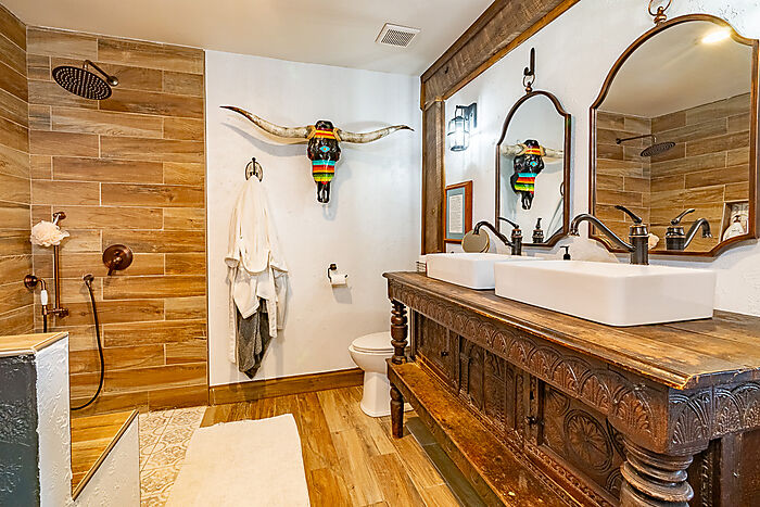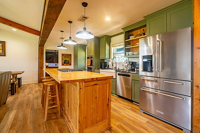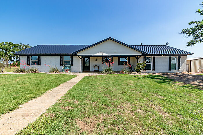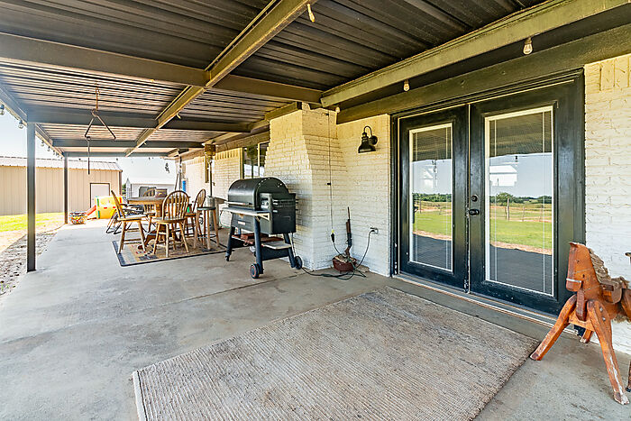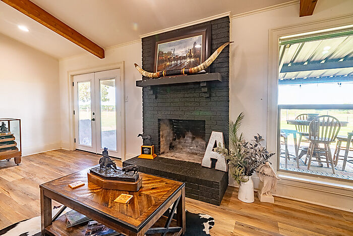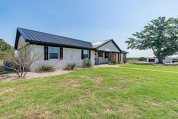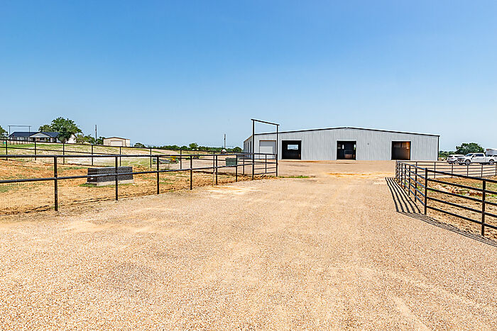 Home - Approximately 2036 sf remodeled brick home, featuring 3 bedrooms, 2 full baths, and an office. An open concept living room, kitchen, and dining area, with a custom 18' exposed beam across the ceiling. The kitchen features stainless steel KitchenAid appliances including a dishwasher, double oven, and gas cooktop on a large butcher’s block island and eating bar. The countertops are black & white granite with a porcelain farmhouse kitchen sink in between. Painted enclosed cabinets. Beautiful wood laminate floors throughout. The master bath has an open tile shower, separate ornate cooper tub, a custom antique vanity supporting dual vessel sinks, and oil rub bronze water fixtures. A covered back porch facing north. The 2nd bath is a tub/shower combination. 1 a/c unit and one tankless hot water heater. A metal roof. Originally built in 1975. Steel shop building – 30x30 with galvalume exterior, a concrete floor, regular door, and rollup door. Roping Arena - 150x265 with automatic roping chute and 200' Lannie Ashley cutting machine. Chip and seal driveway.