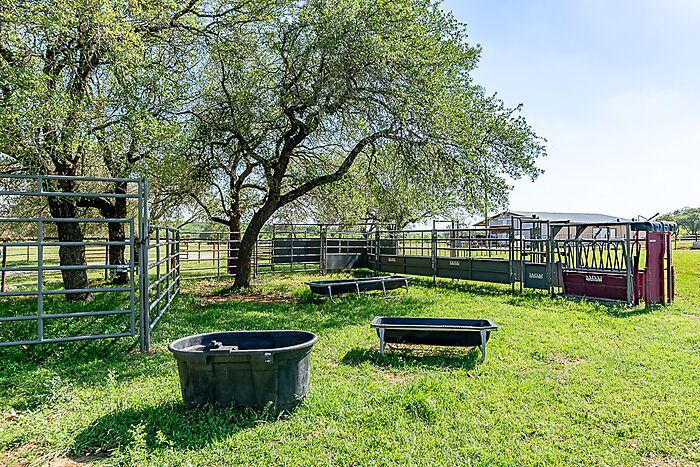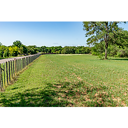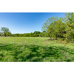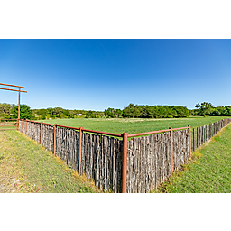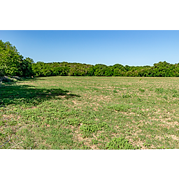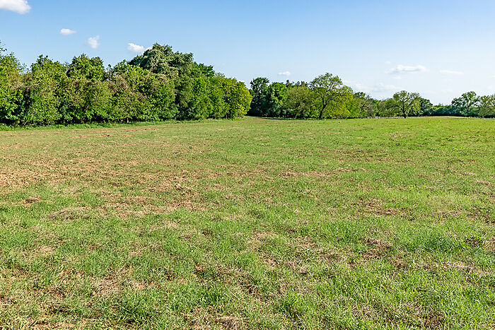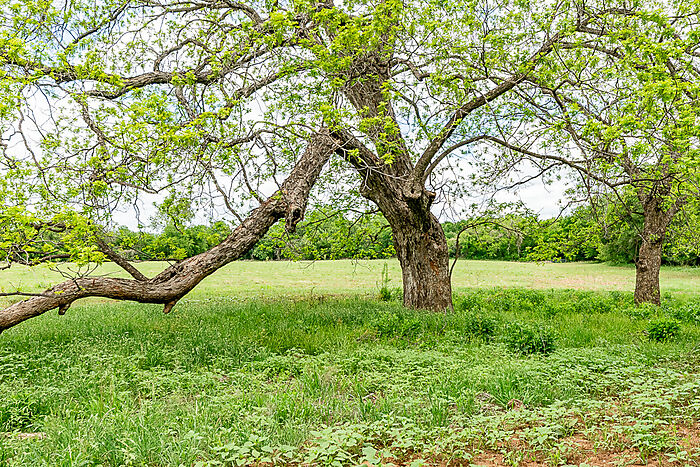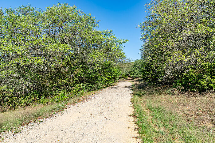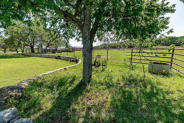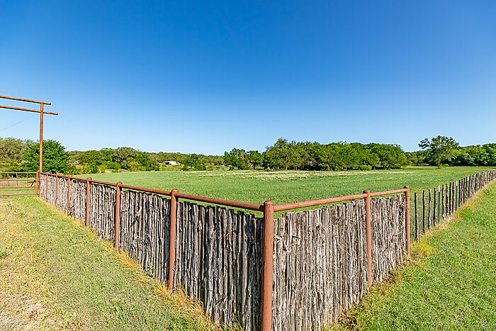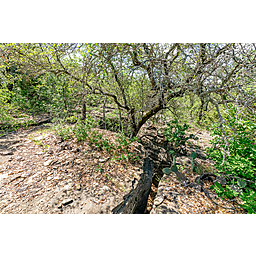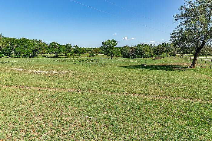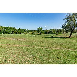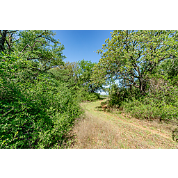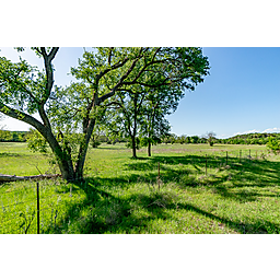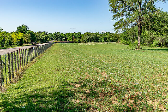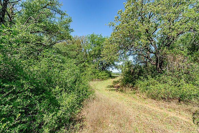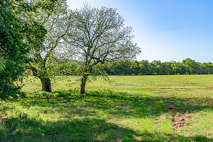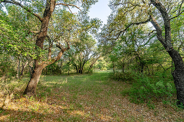 TERRAIN: A large, elevated plateau with thick to scattered trees and some open rolling meadows. Sloping terrain with thicker tree cover. 2 river bottom pastures previously sprigged in coastal bermuda with huge pecan trees. Past & present use is agricultural and recreational. 160 feet of elevation change from the river bottom to an elevated plateau presenting beautiful views along with “Hick’s Bluff”. Diverse tree cover including live oak, post oak, elm, mesquite, cedar, pecan, Texas ash, hackberry, red oak, and deer browsing species. Limestone outcrops and some old limestone fences show evidence of long ago. Some prickly pear and yucca plants. Huge limestone boulders with large cracks along the bluff.