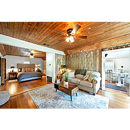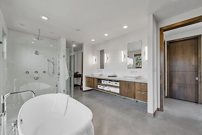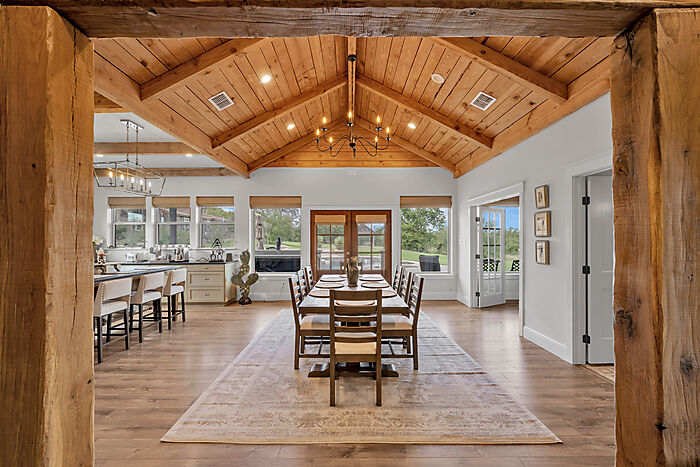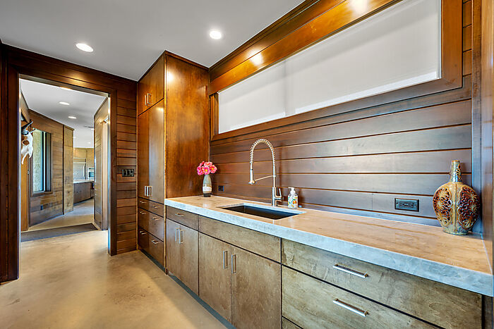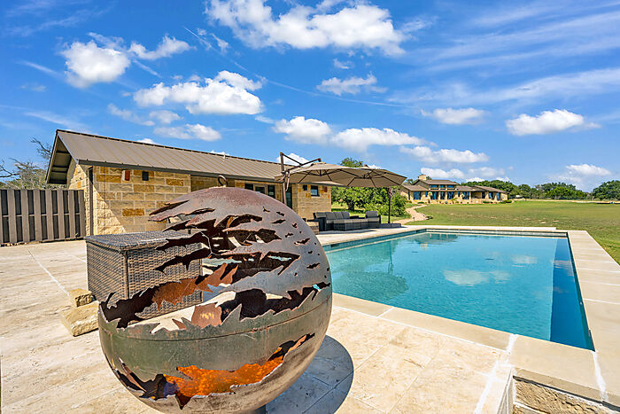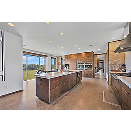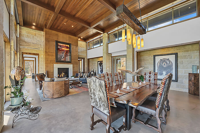 The 4,782 square foot main home with stone walls and wood ceilings offers natural light and panoramic views through expansive windows on the southern exposure. Each part of the home flows seamlessly into the next where no expense was spared to bridge the gap between the gorgeous interior and the natural beauty surrounding the ranch. The west wing contains the master suite, ensuite with garden tub, an amazing shower, his and hers walk-in closets, and a home gym with floor-to-ceiling glass doors that lead to an outdoor patio. Automatic blinds can be lowered, transforming the space into a tranquil retreat with its own fireplace. The heart of this architectural masterpiece is a living room, formal dining area and kitchen that is as equally suited for large gatherings as it is for intimate meals with a few family or friends. The chef’s kitchen is replete with built-in Wolf and Subzero appliances, stone countertops, breakfast nook and patio door leading to the outdoor kitchen.