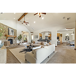 The heart of the home is the chef’s kitchen, complete with double wall ovens, stainless steel appliances, granite countertops, two islands—one with a copper prep sink, and the other featuring a large copper sink overlooking the living area. Additional upgrades include custom cabinetry throughout, vaulted ceilings with exposed beams, and built-in speakers for a premium audio experience.