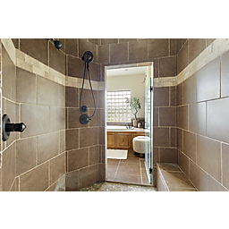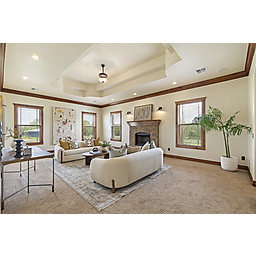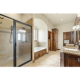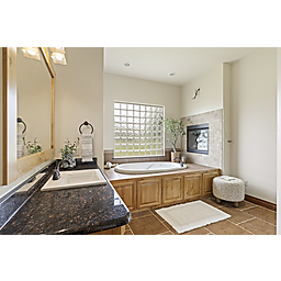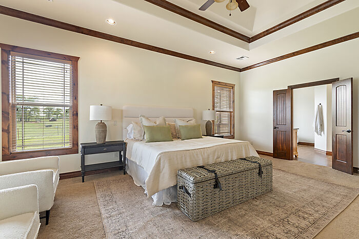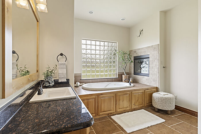 The primary suite is its own private retreat with his and her vanities, a jetted soaking tub with fireplace, pass-through shower, and a massive walk-in closet. Even the family dog has its own custom pet shower in the garage!