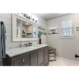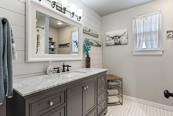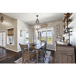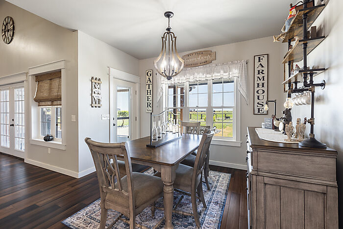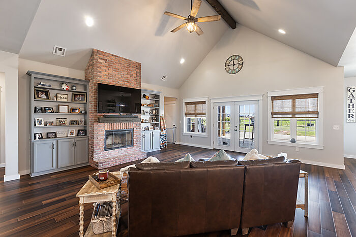 The kitchen features leathered granite countertops, soft-close cabinetry, a farmhouse sink, and opens to both the dining and living areas. Other features include a laundry room, spacious dining room, 3-car garage with attic storage, storm shelter, and full spray foam insulation throughout the home and garage.