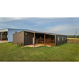 A 180x60 metal shop includes a 90x60 enclosed portion with concrete flooring and a 90x60 open-air area with dirt footing—perfect for indoor riding or large equipment storage. The trailer barn/lean-to is 50x60 and is wired for electricity. Additional outbuildings include a covered 54x64.5 working pen, three livestock lean-tos, and a stall barn with 3–6 covered stalls, tack room (12x24 insulated with heat/air), 6 mounted saddle racks, water, and electric.