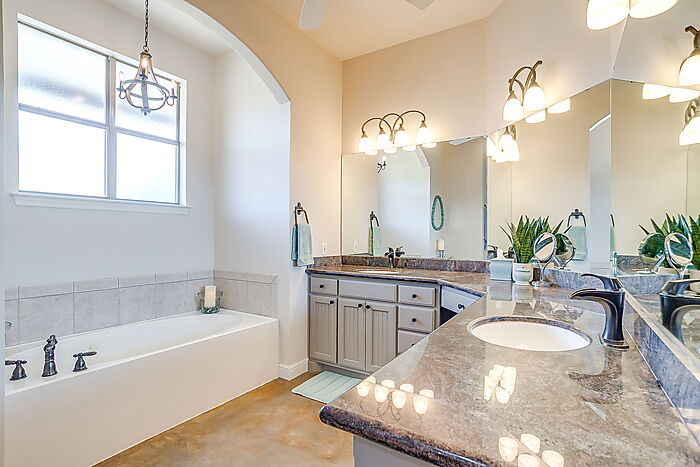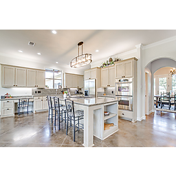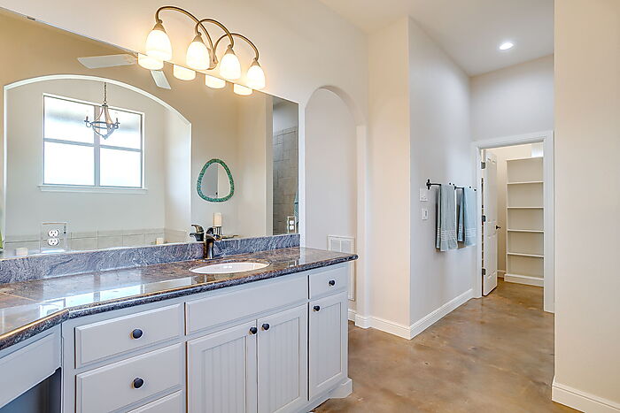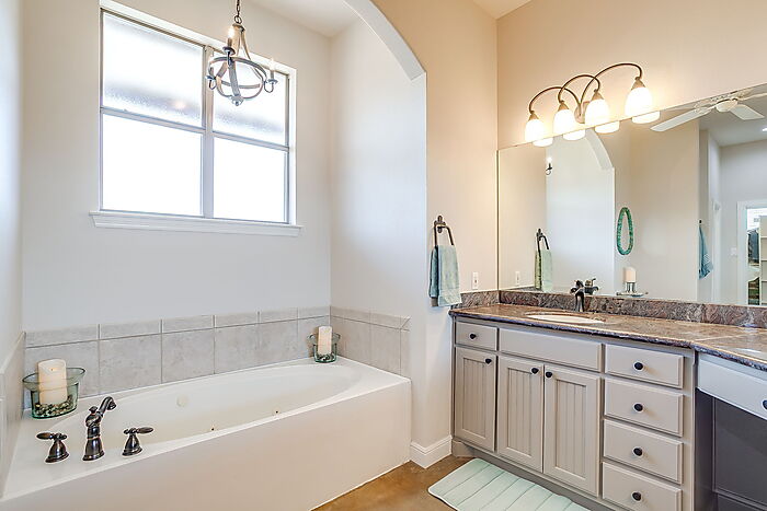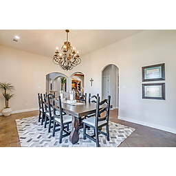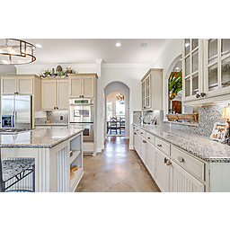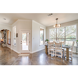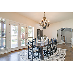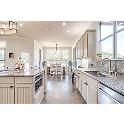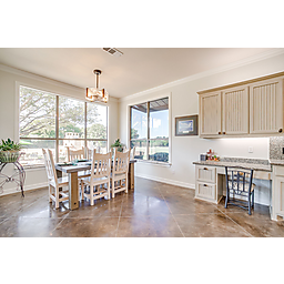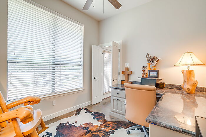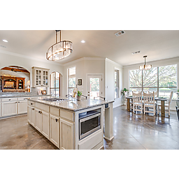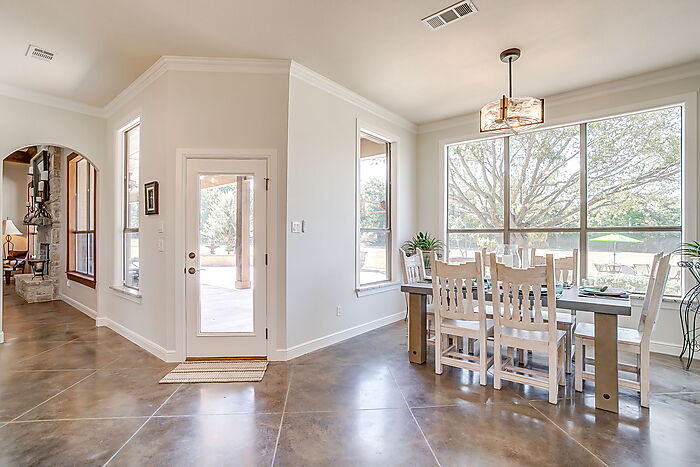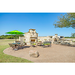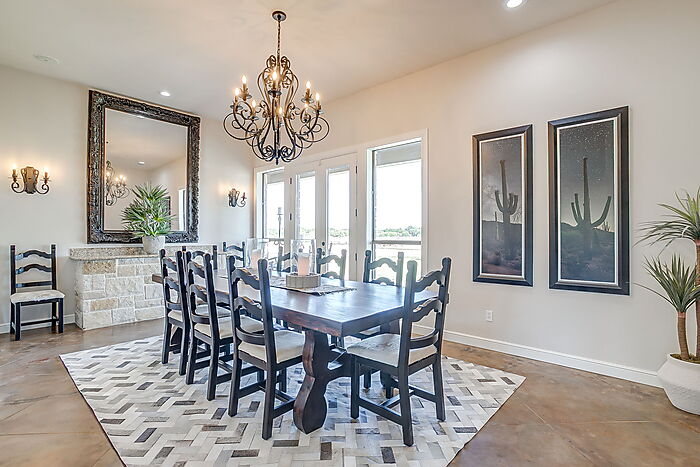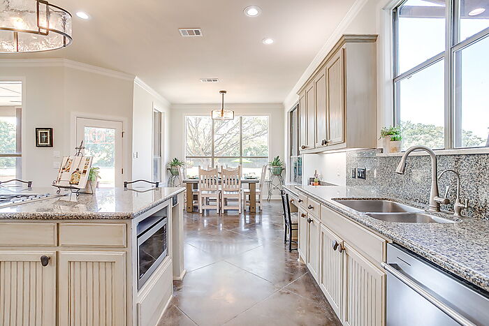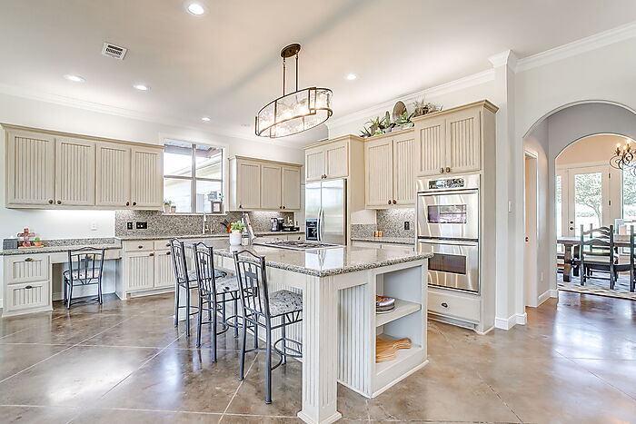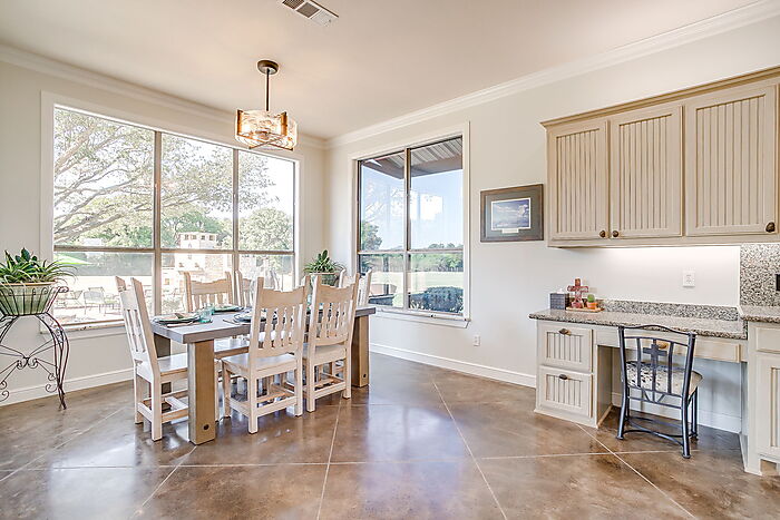 The gourmet kitchen is designed for gathering, cooking, and entertaining. It features a spacious granite island with bar seating, a gas cooktop, custom cabinetry, and a dining nook framed by windows overlooking the outdoor living area. Step outside to enjoy the expansive covered patio, complete with a gas fireplace and wood-burning pizza oven, ideal for family nights or hosting unforgettable parties under the Texas stars.