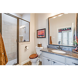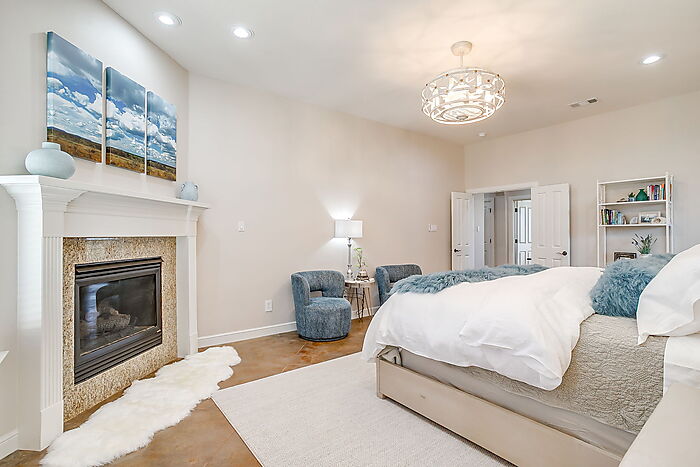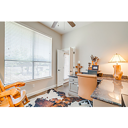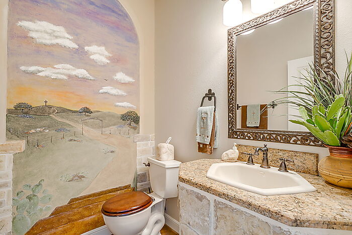 On the private wing of the home, the luxurious master suite offers a peaceful escape with its own fireplace, a generous bathroom, walk-in closets, and a dedicated office with large windows bringing in natural light and serene views. A second en-suite bedroom, currently used as a media viewing room, can easily adapt into an additional office, gym, or guest suite with French doors opening to the patio. Upstairs, three more bedrooms provide flexible living, two with their own en-suite baths. These rooms can serve as guest quarters, children’s rooms, additional offices, or playrooms. Every window frames views of the property’s beauty, from rolling pastures in the front to wooded acreage in the back.
