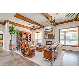 Inside, the home is equally impressive. Guests are welcomed into a grand Great Room with soaring 12-foot ceilings accented by rustic beams and anchored by a striking stone fireplace. The formal dining room comfortably hosts 10 guests and opens through French doors onto the covered front porch for evening relaxation, or quiet mornings in rocking chairs.