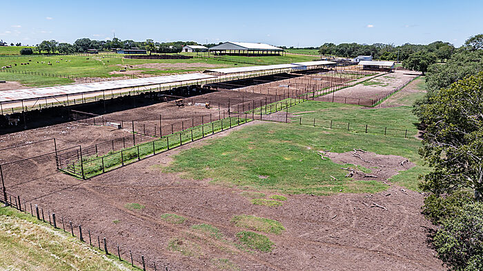 For livestock care, the ranch features 13 lush pastures, each equipped with concrete bunks and water troughs to ensure a nurturing environment for your animals. Four shaded turnout pens add to their comfort, while a processing barn includes a hydraulic chute and sorting and shipping pens, along with a 40-foot scale for efficient management of your herd. This remarkable property is supported by three water wells, ensuring a consistent water supply for all operations. Experience the ideal blend of rural living, top-notch facilities, and endless opportunities at West Navidad Ranch.