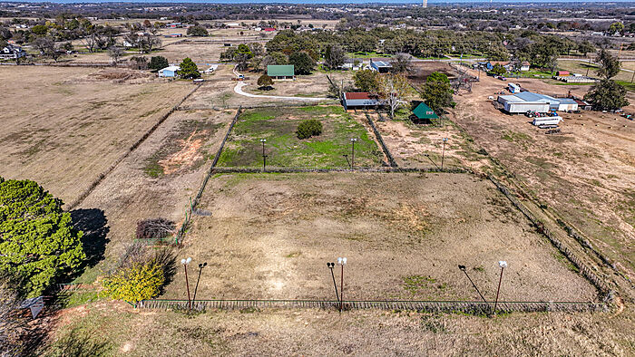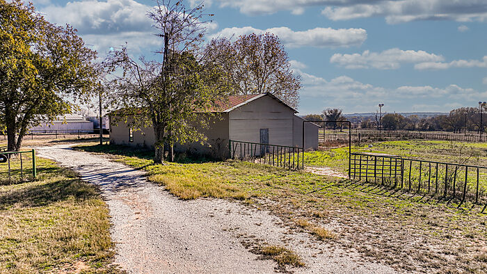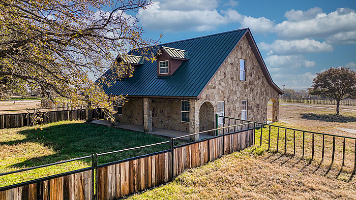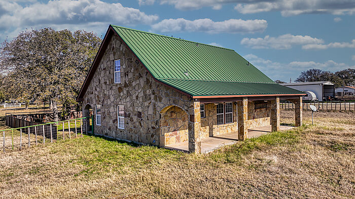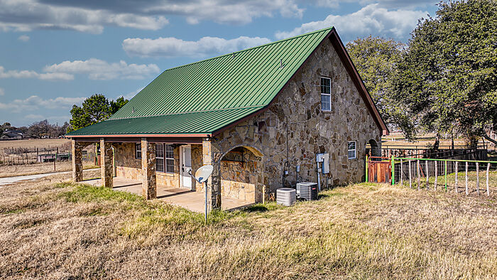 Experience true peace and privacy on your own ranchette. Set on 6.988 secluded acres with a pond, this property is perfectly equipped for your chickens, horses, and country lifestyle. Thoughtfully improved, it features a 1,900± SF workshop, a barn with four run-ins, and a lighted, fully piped roping arena framed by a stunning backdrop of mature live oak trees. The land is fenced and cross-fenced with top rail and cedar staves, and water spigots are conveniently located throughout the pastures. An 800± SF framed structure—already outfitted with water and electricity—is ready to become a guest home, office, or bunkhouse. The property is also well-capable and positioned outside city limits with an existing AG exemption in place. The charming all-stone home with a metal roof offers the perfect blend of coziness and character. Sip your morning coffee on the peaceful front porch, then unwind in the evening with a glass of wine on the back porch overlooking the wide-open pasture after a night of roping with friends. Inside, the warm, inviting kitchen and family room flow seamlessly together and lead to the primary suite, complete with its own ensuite bathroom featuring a classic claw-foot tub. Upstairs, you’ll find two generously sized bedrooms full of natural light and rustic charm. A property filled with character, functionality, and the quiet beauty of country living—you won’t want to leave.