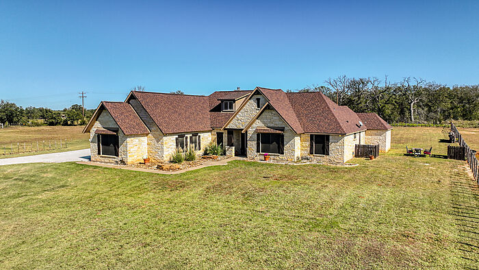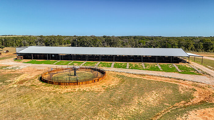 This property carries undeniable value with its easily accessible location just off US Hwy 281. Set on 48.5 acres, as you make your way through the property, you’ll pass the fully stocked pond and peaceful hunting space, often home to grazing deer, on your way back to the beautiful Austin Stone home and the professionally designed training complex. The facility features 85 total stalls, six covered turnout runs, four fully fenced pastures, a brand-new custom Priefert walker, covered round pen, 150’x250’ roping arena, 5 pipe cattle pens, three 50 amp RV plugs, dedicated shavings storage barn, gated entrance, and more. In 2024, the main barn was fully constructed, including 75 (12x12) stalls that easily convert to 38 generous (12x24) stalls, a 3-horse wash bay, and a first-class covered 50’ round pen with 8’ walls, premium footing and a comfortable viewing area overlooking the 370’x80’ horseman's sanctuary. Additional amenities include LED lighting throughout the entire barn, a beautiful custom wood-finished programmable 6-horse Priefert panel walker, and a dedicated 30’x80’ equipment storage barn for all operational needs. The second barn includes 10 stalls with concrete alley, wash bay, six covered runs – perfect for show horses, mares, or yearlings and a walkway to the fully equipped roping arena ready for all of your cow horse needs featuring 5 pipe cattle pens, 2 with automatic waterers. Follow the long, beautiful drive through the property to the secluded 2,700+ sq ft residence, providing a comfortable retreat after long days around the facilities. With an oversized 2 car garage, 4 bedrooms, 3.5 baths, granite countertops, a spacious kitchen island, versatile office or dining space, gas stove, and a cozy rock fireplace. Step out onto the covered back patio, wired for an outdoor TV, and enjoy overlooking treelined pastures and a rock fire pit, creating the perfect spot to unwind or entertain.