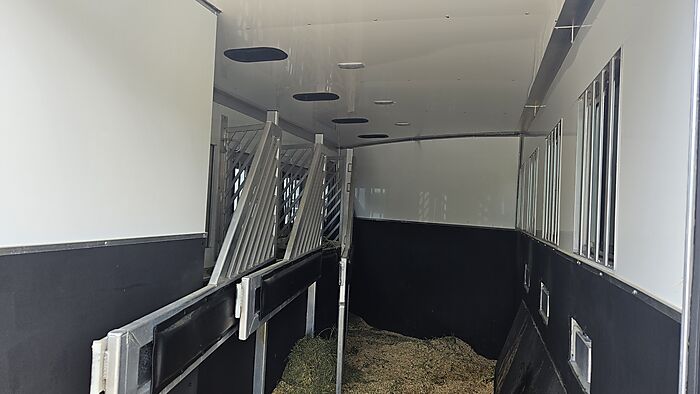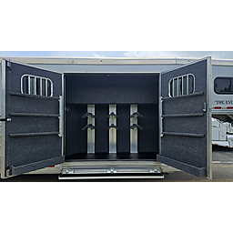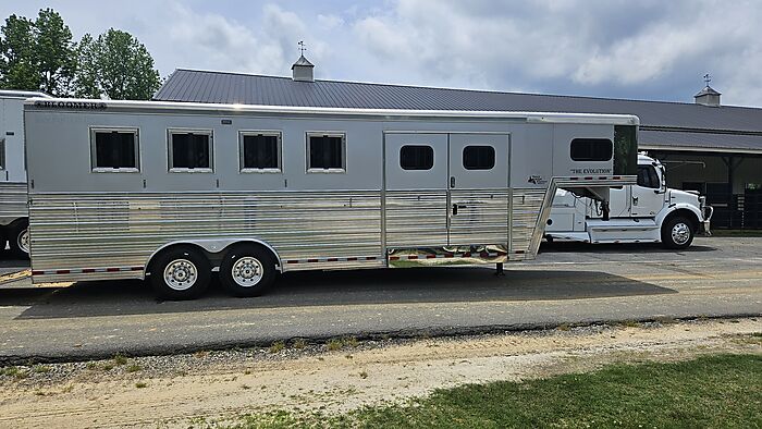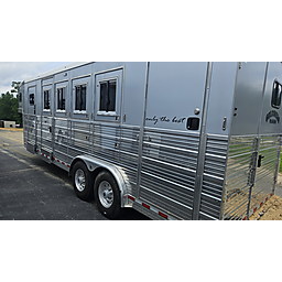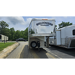 Barely used 2018 Bloomer 4 horse trainer trailer, huge double door side tack, rear broom closet, ramp, drop doors on head and tail, mangers, stud wall, ELECTRIC BRAKES, 16in alcoa wheels, dressing room with boot box, escape door.