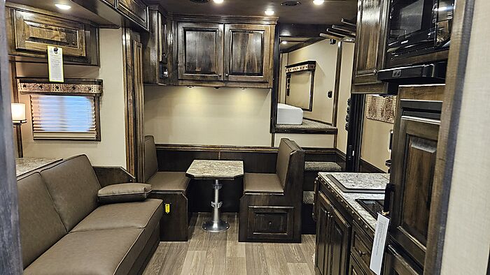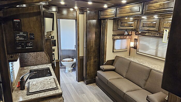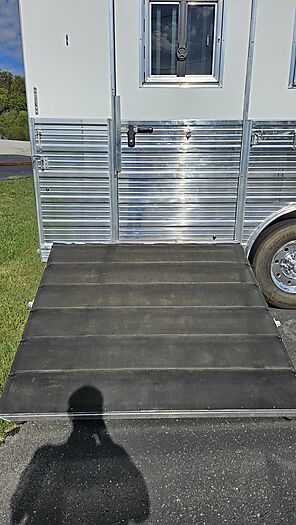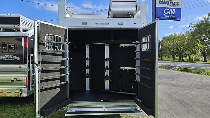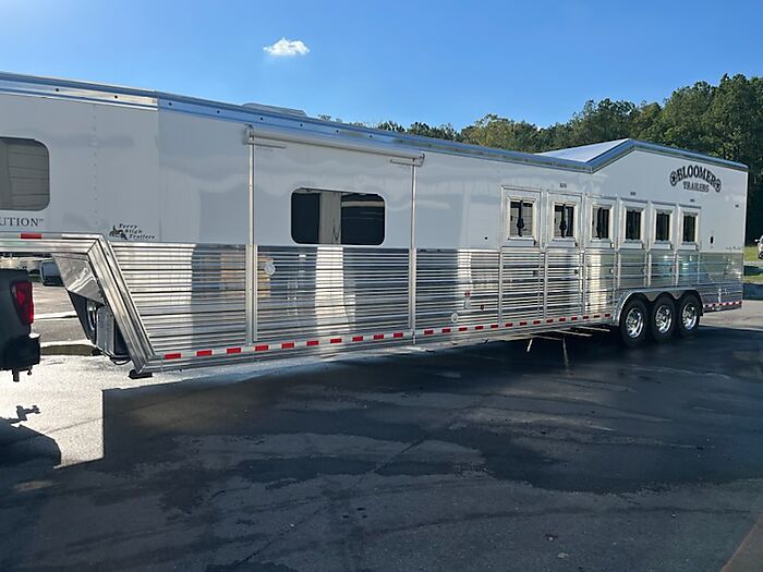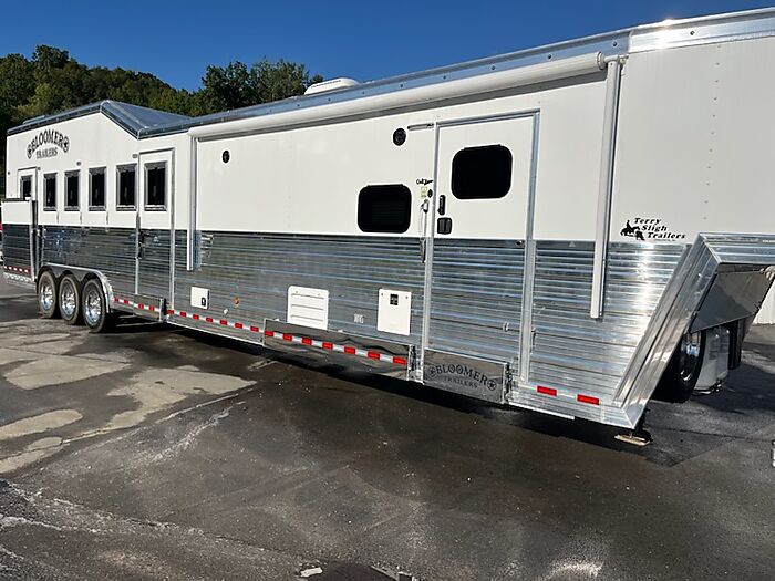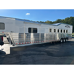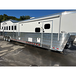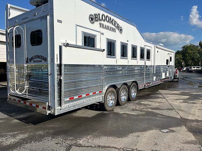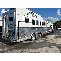 Brand new 2025 Bloomer 6 Horse LQ with a 14.8ft short wall Outlaw Conversion! 3 8500lb axles with 19.5 Alcoa wheels, 1 slide, Integrated hay pod, Drop doors on head and tail with shocks on head side, mangers, dual hydraulic jacks, electric over hydraulic brakes, Gas Onan generator, Full Rear Tack, PC load with ramp, escape door on curb side, pass thru door, Full dinette, sleeper sofa, microwave and cooktop, stud divider in front stall, 2 tvs, READY TO HAUL!