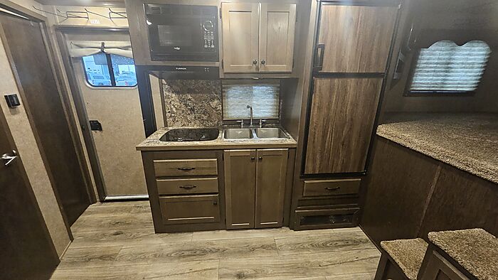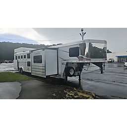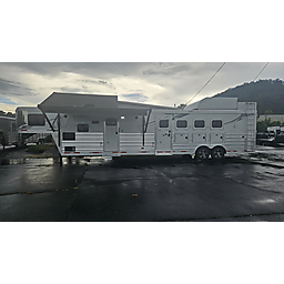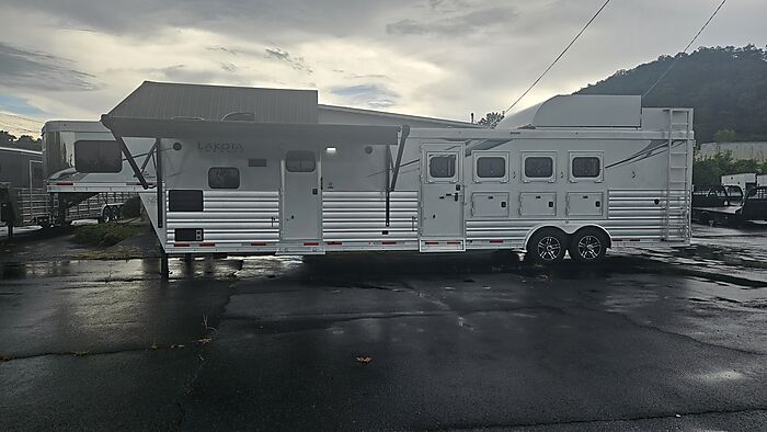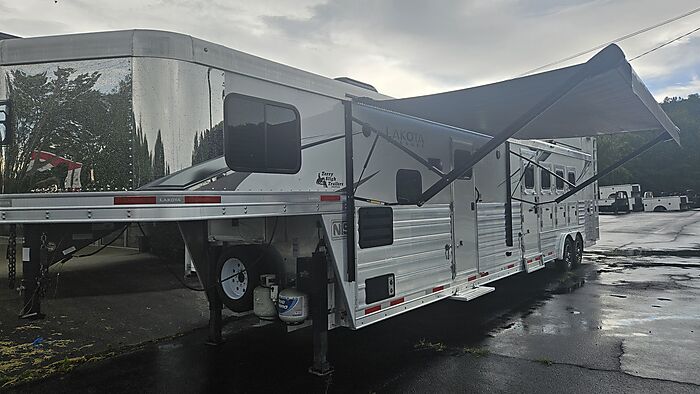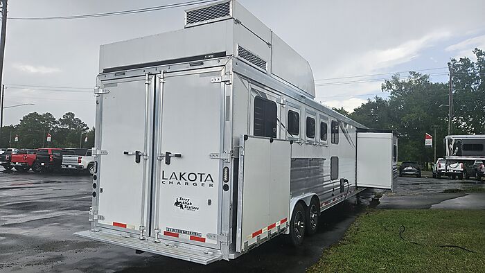 2023 Lakota Charger 4 horse, PC Load with bunk beds! 15.8ft sw, drop doors on head and tail, mangers, hay pod, generator on top, 17.5 wheels and tires, electric brakes, dual hydraulic jacks on front, dinette in slide, big bathroom, stove and microwave, bunk beds in the rear behind bath.