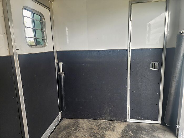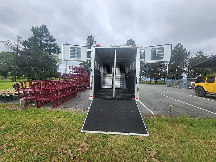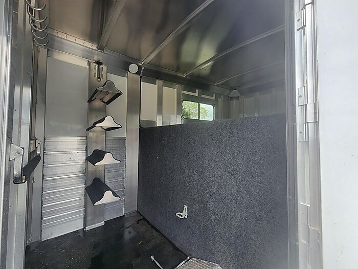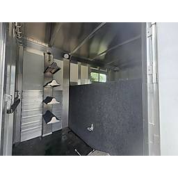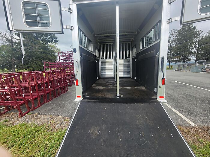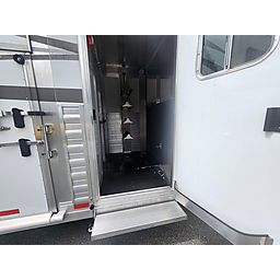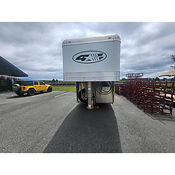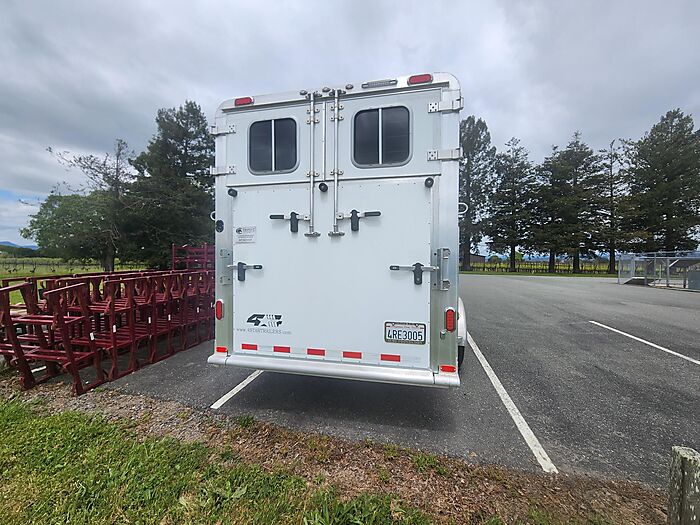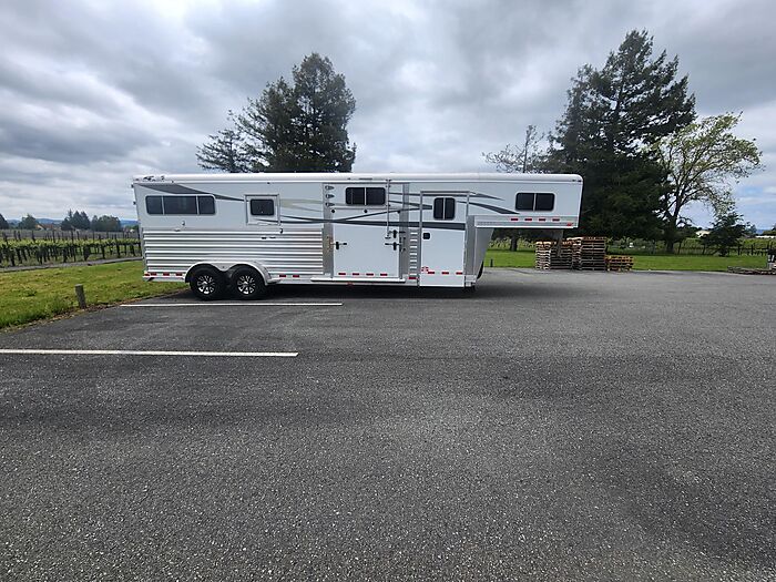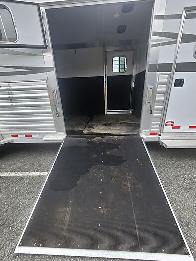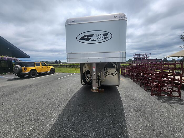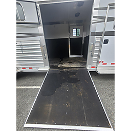 Used 2020 4 Star 2+1 Warmblood sized gooseneck trailer-24'6" x 7'6" tall-Extra large plus one compartment 114". Extra long stalls and manager area 84" + 42"-stow away bar at side ramp. 7000# axels-Lined and insulated horse compartment roof-EZ lift side and rear ramps, both 60" tall, quiet ride divider. Loading lights, interior lights, full height stud doors with drop windows, roof vents in plus one compartment and over straight load stalls. Walk through door in bulkhead, fold down step at dressing room door. 2 saddle racks on removable post, brush tray, bridle hooks, blanket bar, rubber floor mats throughout trailer.