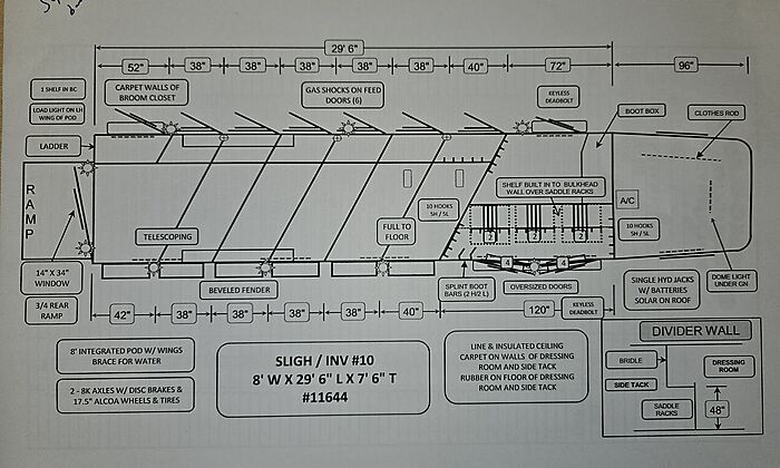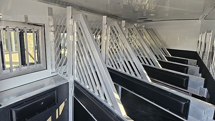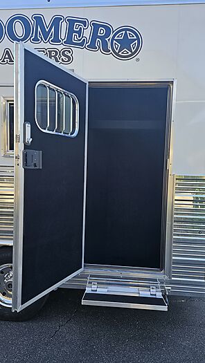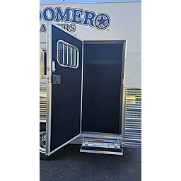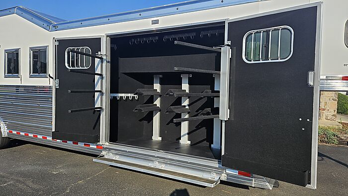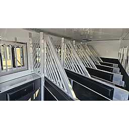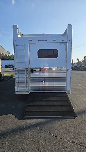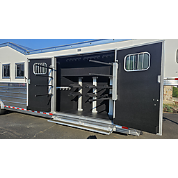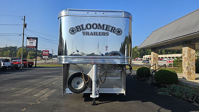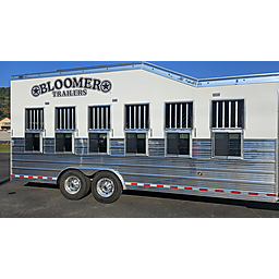 Brand new 2026 Bloomer 6 Horse trainer trailer, drop doors on head and tail with shocks on feed doors, managers, integrated hay pod, stud wall, 17.5in Alcoa wheels with two 8k lb axles, broom closet in rear, ramp, huge double door side tack with shocks on blanket bars, front dressing room with boot box, keyless deadbolts, hydraulic jack, electric over hydraulic brakes. 8 wide 7'6 tall.